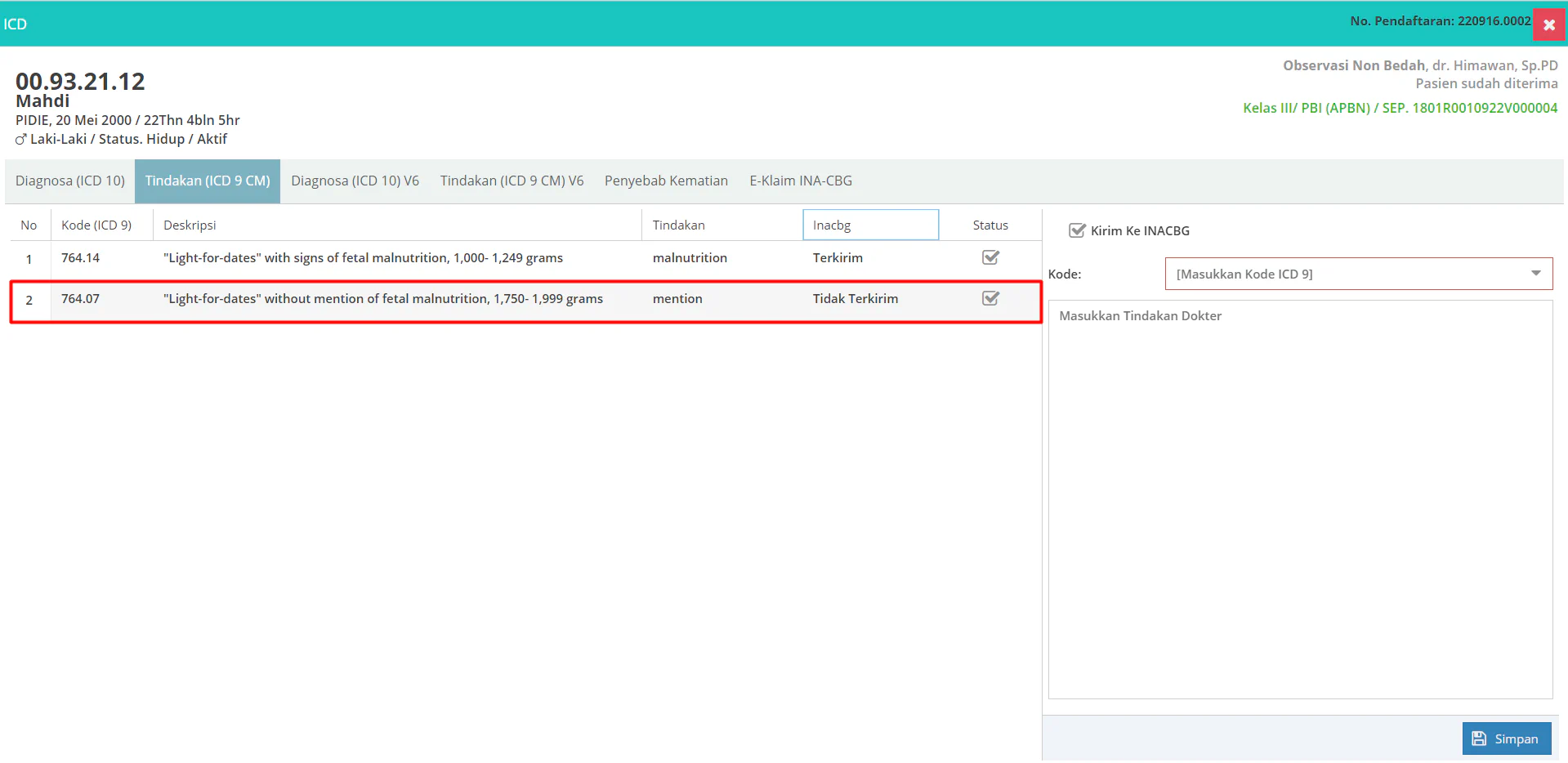 1. Pertama-tama masuk ke menu Tindakan (ICD-9) lalu centang pada kolom “Kirim Ke INACBG” dan klik tombol “Simpan”
